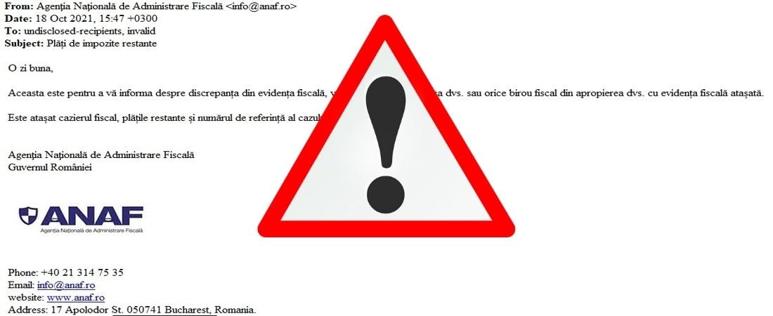 Agenţia Naţională de Administrare Fiscală a anunțat într-un comunicat recent faptul că aceasta nu utilizează adresa de mail info@anaf.ro, deși hackerii au folosit denumirea, logo-ul și coordonatele instituției, precum numărul de telefon și adresa poștală.