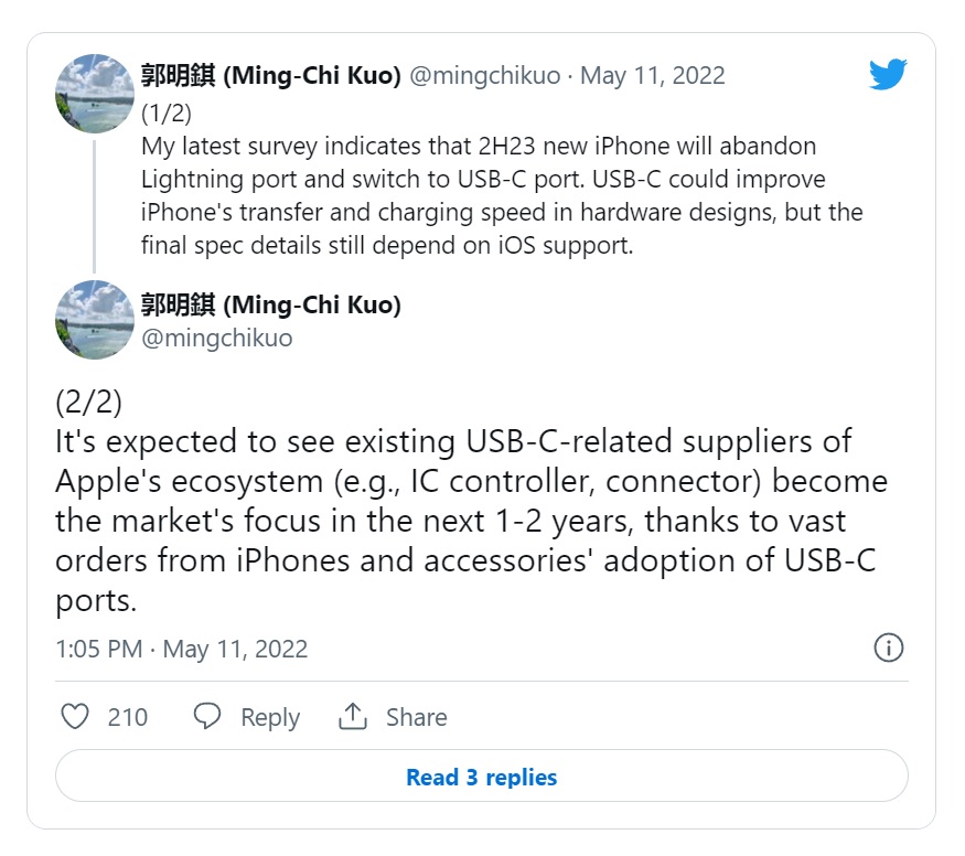 Kuo a scris că adoptarea USB-C „ar putea îmbunătăți transferul și viteza de încărcare a iPhone-ului în designul hardware, dar detaliile finale ale specificațiilor depind încă de suportul iOS”.