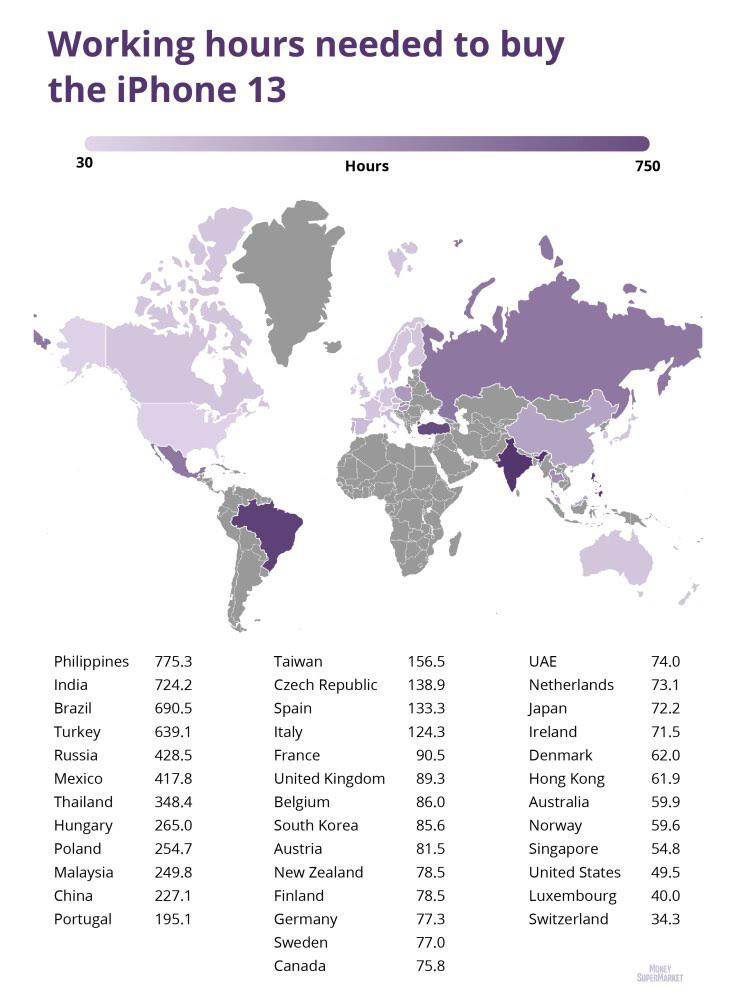 De exemplu, pentru Marea Britanie, calculul a pornit de la salariul de 6,56 lire pe oră, pe care îl primesc doar angajații cu vârsta cuprinsă între 18 și 20 de ani. Pentru o remunerație de acest tip, un englez la începutul carierei va trebui să muncească peste 89 de ore (mai mult de două săptămâni) pentru a-și permite noul iPhone 13, dacă acesta ar costa doar 799$, adică puțin peste 586 lire.