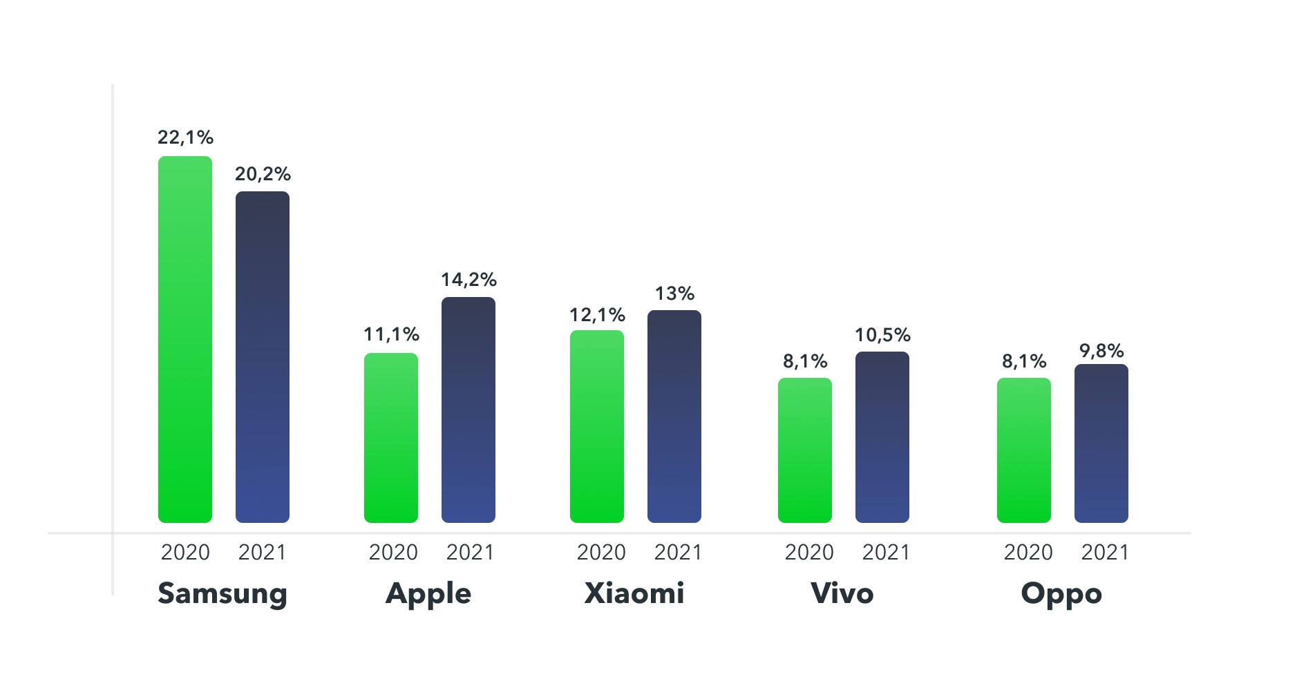 Între timp, Apple a înregistrat vânzări în creștere cu aproape opt milioane de unități, iar cota sa a crescut de la 11,1% la 14,2%. Acest lucru a fost suficient pentru ca firma să recupereze locul al doilea de la Xiaomi, care a coborât pe al treilea, în ciuda creșterii cotei sale de la 12,1% la 13% și a faptului că vânzările companiei chineze rămân constante. Vivo și-a crescut cota de la 8,1% la 10,5%, în timp ce Oppo a crescut de la 8,1% la 9,8%.