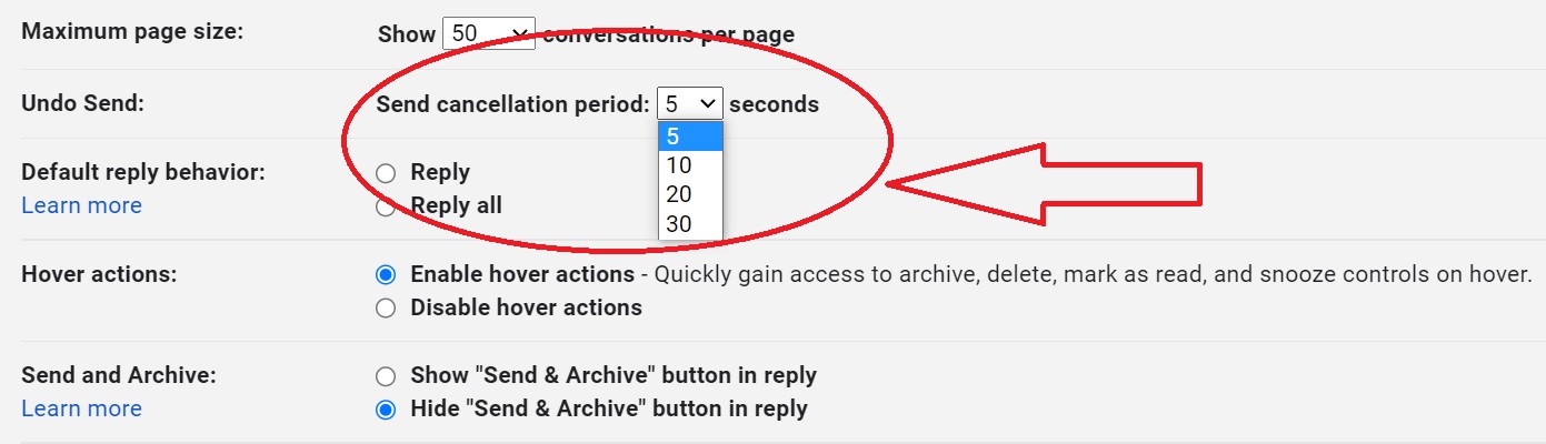 În pagina care se va deschide vei avea opțiunea de a selecta pentru câte secunde vrei să ai posibilitatea de a da UNSEND unui mail.