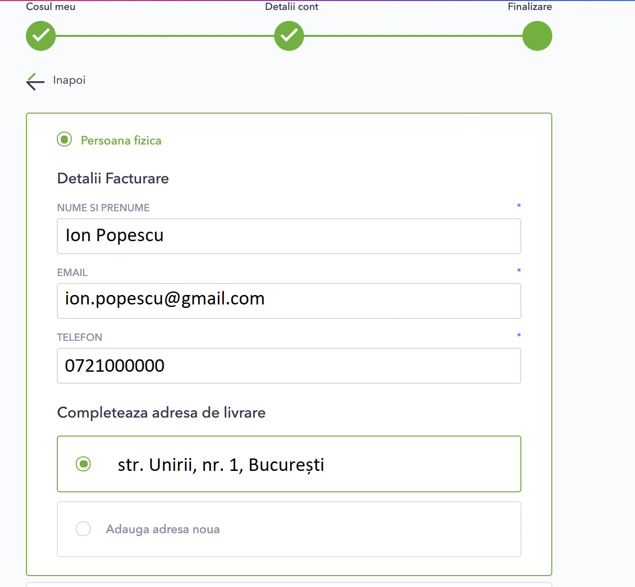 Astfel, dacă ai o adresă deja adăugată în cont, în momentul plasării comenzii, adresa respectivă va fi prestabilită și astfel va fi mult mai rapid să plasezi comanda, după cum poti vedea în exemplul de mai jos. Dacă alegi să înregistrezi în cont mai multe adrese (de acasă și de la birou, de exemplu), nu uita să o alegi pe cea la care vrei să se facă livrarea telefonului, prin selectarea acesteia.