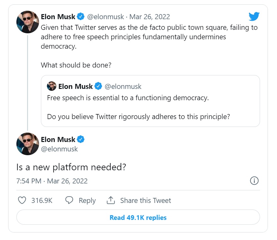 Sâmbăta trecută, CEO-ul Tesla a întrebat într-un poll pe contul său de Twitter, unde este urmărit de aproape 80 de milioane de persoane, ce părere au utilizatorii despre libertatea de exprimare, reprimată uneori pe canalele de social media. 70% dintre cei peste două milioane de respondenți au spus că măsurile de cenzură aplicate pe Twitter contravin cu regulile democrației.