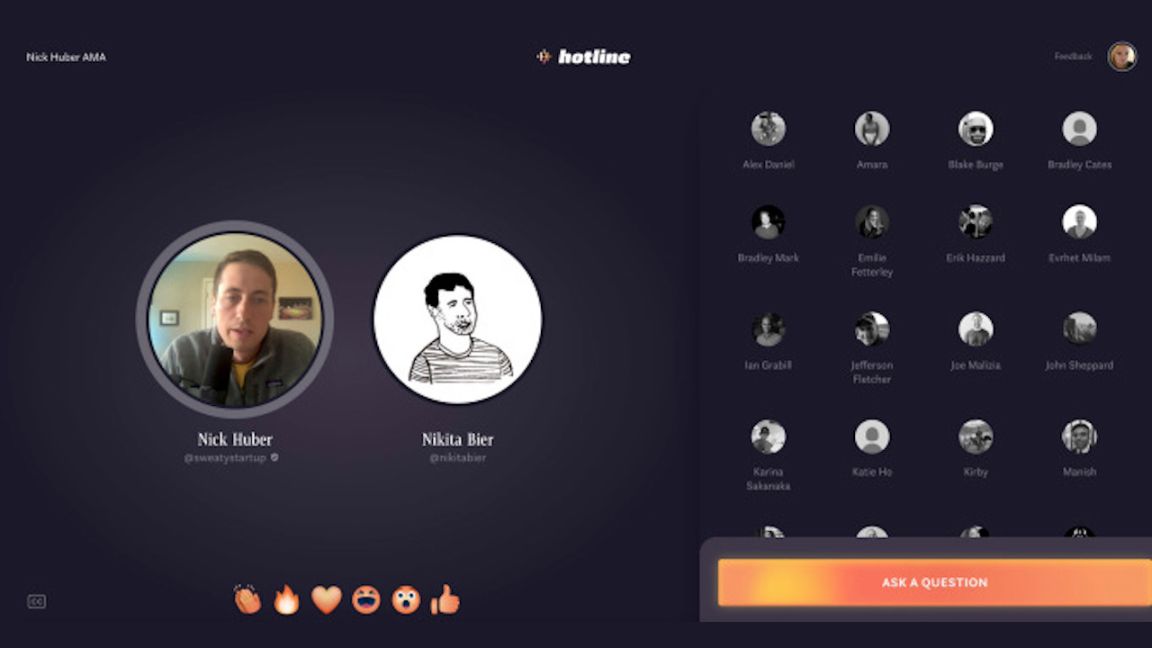 Hotline este împărțită între spectatori, ascultători pasivi și participanți activi, având și funcția de a susține sau de a blama anumite întrebări ale celor prezenți în camerele virtuale, cam cum se întâmplă pe Reddit. Gazdele canalelor de comunicare create pe Hotline au posibilitatea de a alege la ce întrebări să răspundă, de a elimina cererile care li se par a fi necorespunzătoare sau de a da afară persoanele cu o atitudine incomodă.