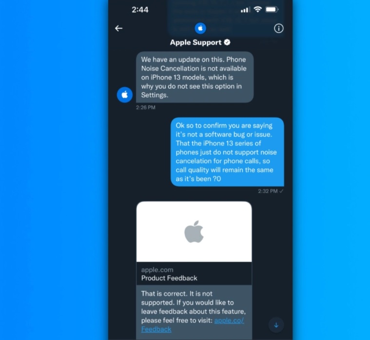 Situația a fost semnalată de către un cititor al 9to5Mac, care a trimis un print screen dintr-o conversație pe care a avut-o cu un reprezentant al departamentului de suport Apple, pe Twitter. Acesta arată că, deși angajatul Apple i-a precizat că problema se va remedia și că va fi anunțat imediat ce funcția va reveni pe telefon, „aparent, problema nu va fi rezolvată, iar anularea zgomotului de fundal este dezactivată în mod intenționat pe aceste dispozitive din motive nespecificate.”