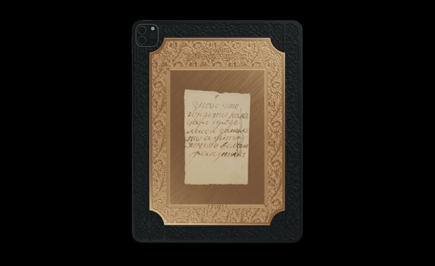 Caviar nu s-a oprit nici de această dată la a lansa doar telefoane inedite. Tot din colecția Autograph face parte și o tabletă Apple. iPad Pro-ul de 12.9 inch, echipat cu un procesor M1, are integrată pe spate o notă originală, scrisă chiar de mâna lui Grigori Rasputin, personajul extrem de controversat, în jurul căruia au apărut tot felul de legende, de care sigur nu ești străin. Mesajul scris în rusă și semnat de Rasputin s-ar traduce prin „Știu că ești la fel de mândru ca Irod, ai intrat ca o vulpe și vrei să pleci ca un lup”.