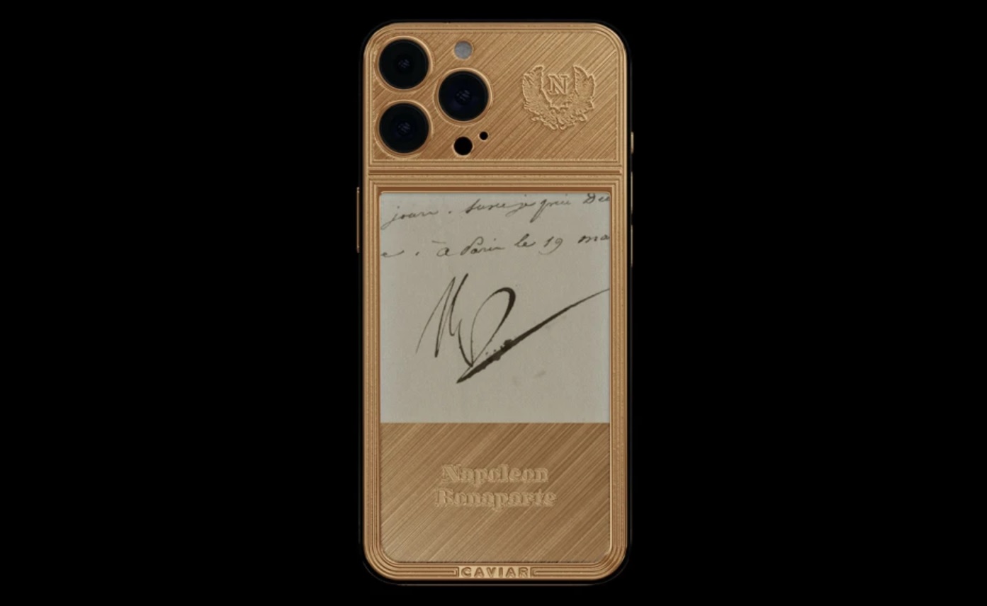 Mai exact, un iPhone 13 Pro care are pe spate un fragment dintr-o scrisoare scrisă de mâna lui Napoleon Bonaparte, alături de semnătura celebrului lider francez, costă peste 75.000 de dolari. Valoarea sa este suplimentată de o carcasă din aur galben de 24 de karate.