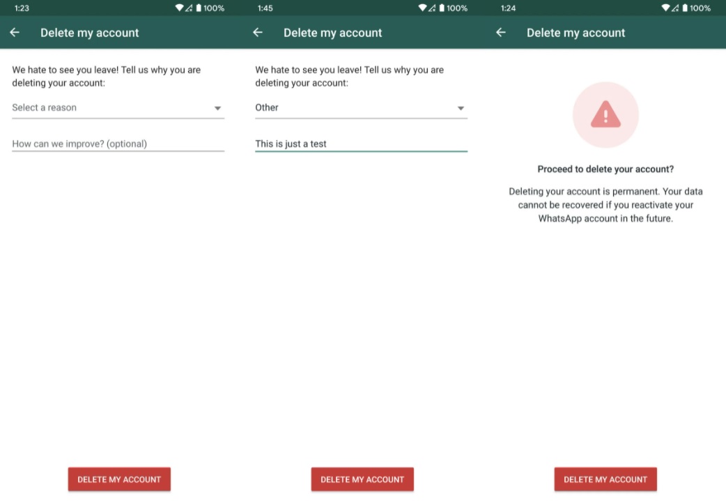 Poate părea ciudat să optezi de atâtea ori pentru aceeași comandă, dar WhatsApp vrea să se asigure de faptul că ești hotărât să renunți la contul tău și nu ai intrat în acel meniu din greșeală. Așa că nu-ți pierde răbdarea!