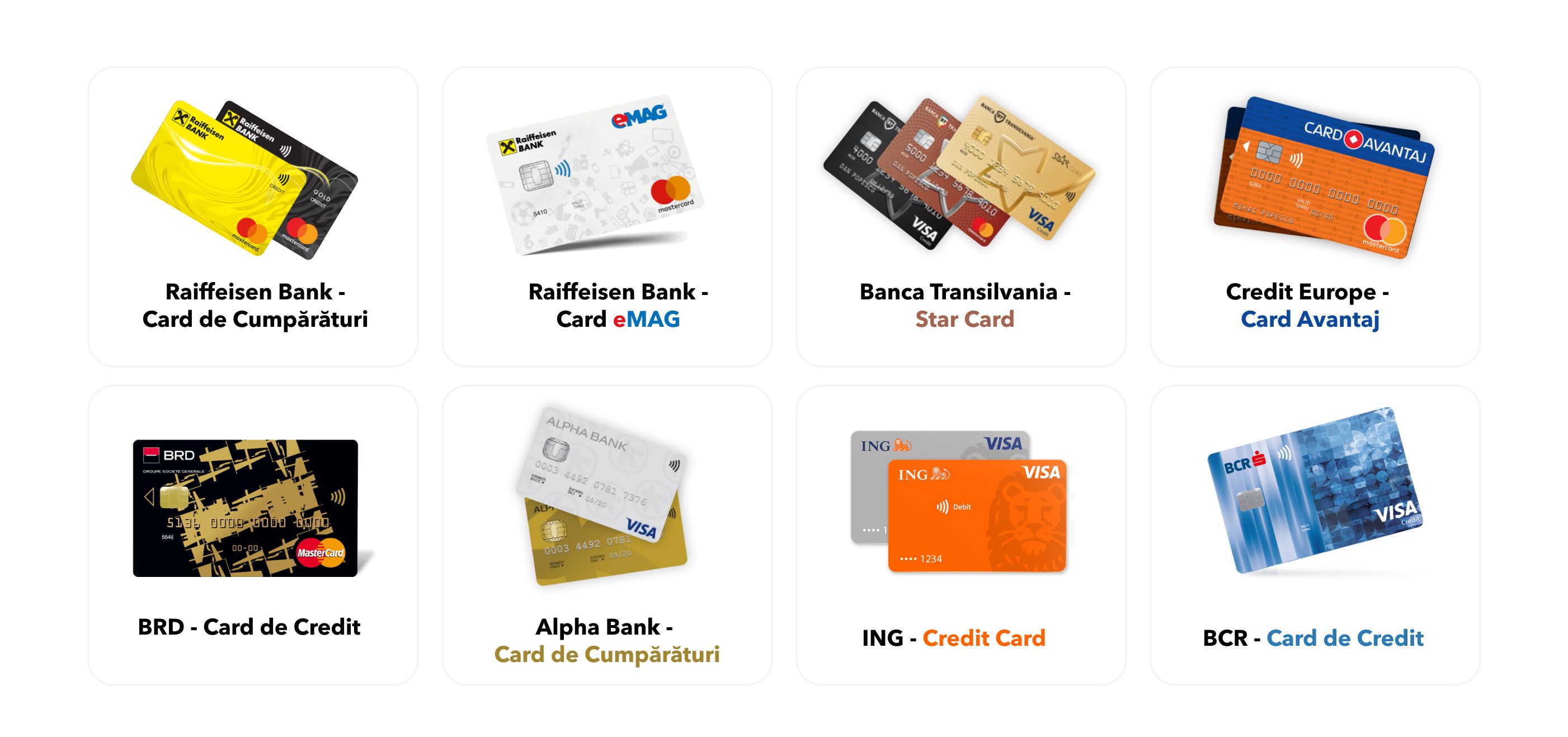 Pentru a cumpăra un produs în până la 12 rate de pe Flip, va trebui să folosești un card de credit (adică un card de cumpărături) din lista următoare:
