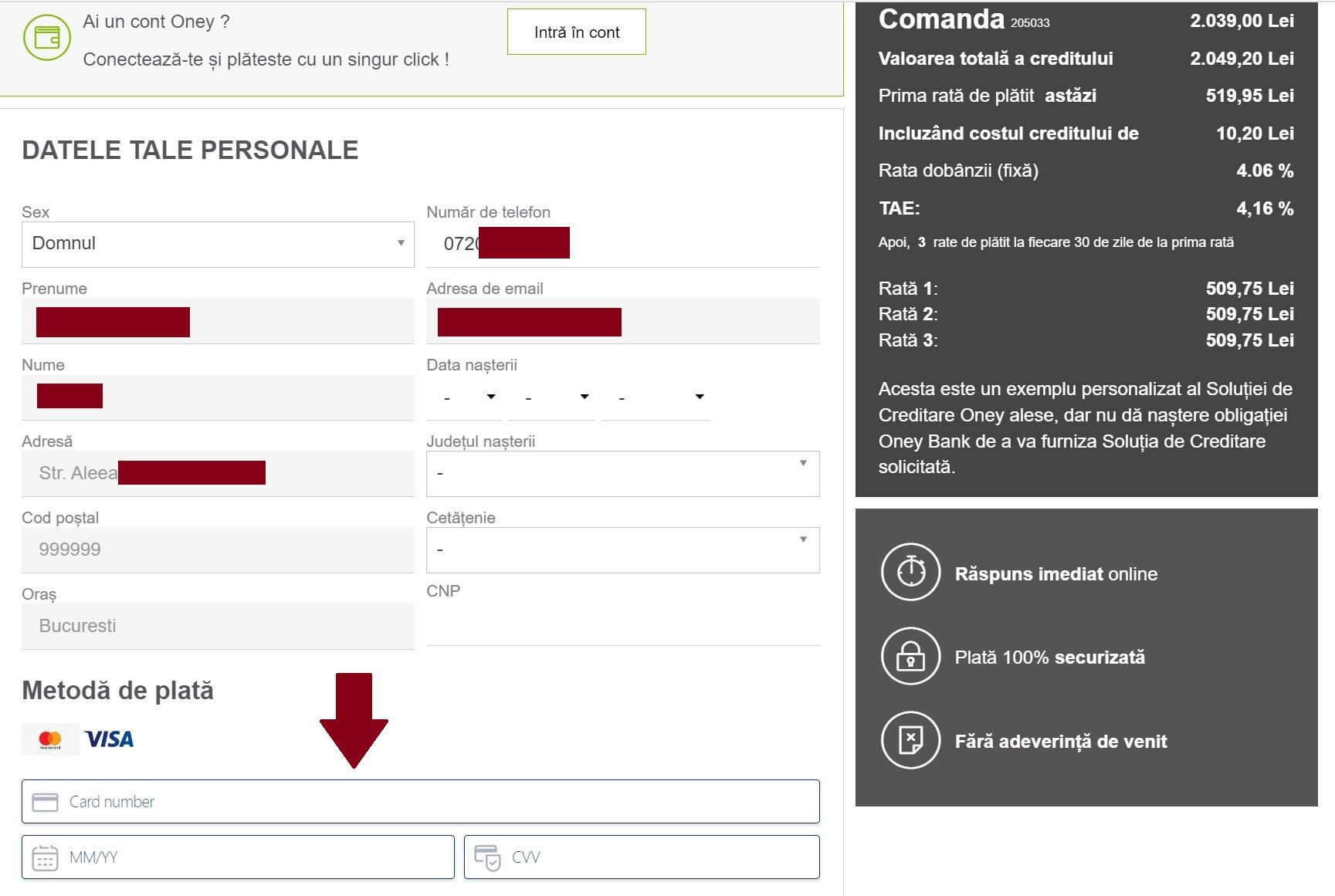 7. dacă ai ales să plătești în 3 sau 4 rate cu cardul de debit (de salariu), vei ajunge într-o nouă pagină, unde va trebui să completezi și restul de date personale, ca mai apoi să treci la completarea datelor cardului tău. După aceea, e necesar să bifezi că ești de acord cu termenii și condițiile generale de creditare online prin Oney, dar și faptul că ai citit și luat la cunoștință politica Oney de protecție a datelor. Uite o simulare a plății prin Oney:
