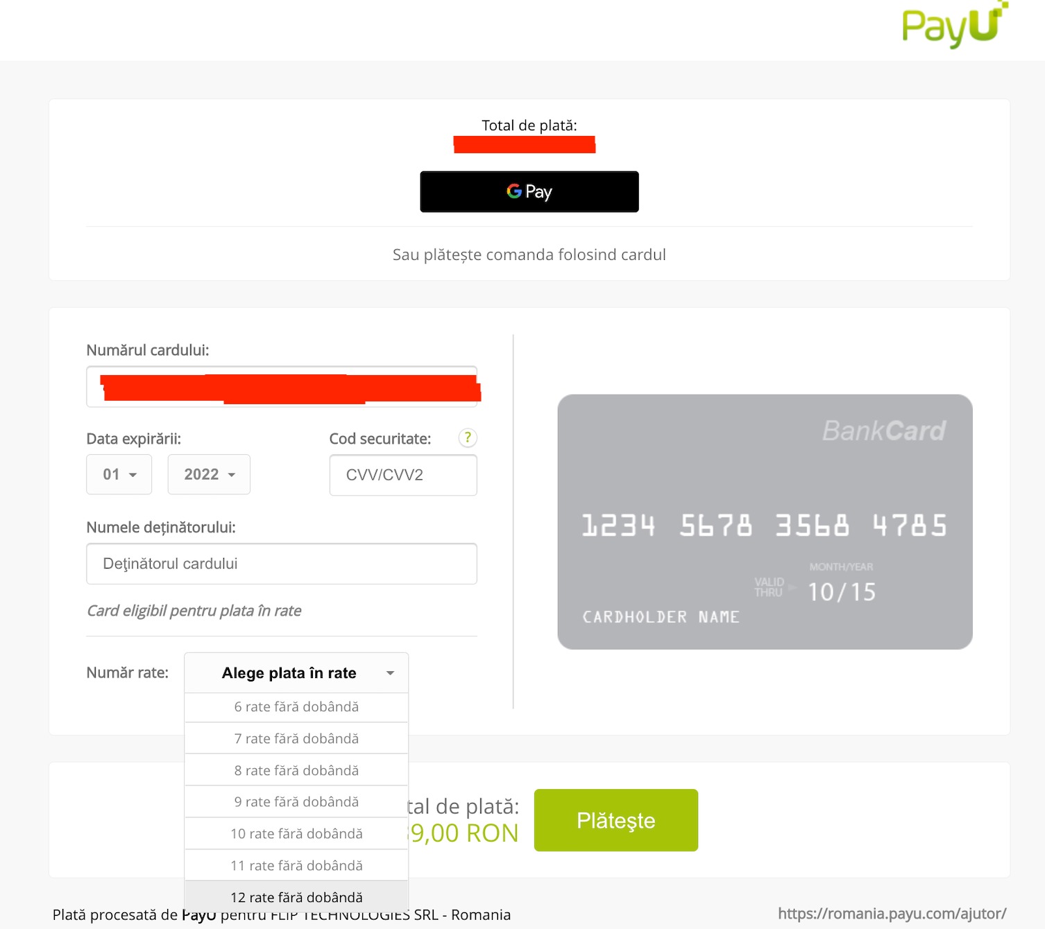 - dacă ai ales să plătești cu cardul de cumpărături, vei ajunge într-o nouă pagină, unde va trebui să completezi datele cardului tău de credit, ca mai apoi să optezi pentru numărul de rate puse la dispoziție de banca la care ai deschis cardul, ca în exemplul de mai jos: